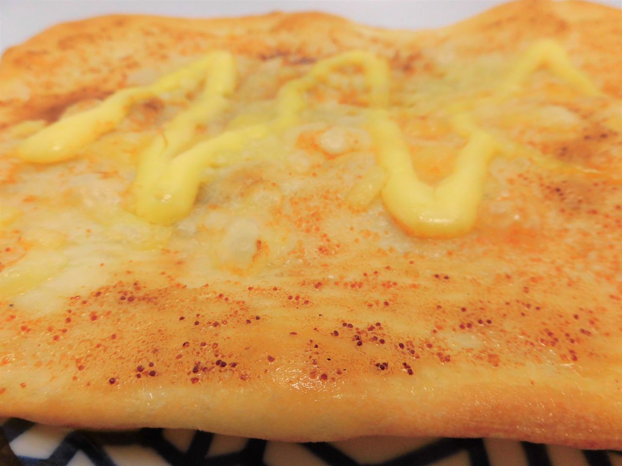 薄いですけどすっごく大きくスライスされたパンに、チーズ、黒コショウ、マヨネーズが掛かっています♪