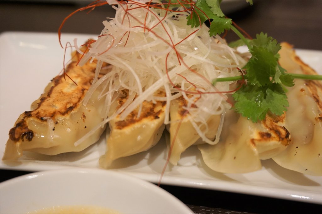 泡立てた酸味の効いたタレで食べるさっぱりとした餃子