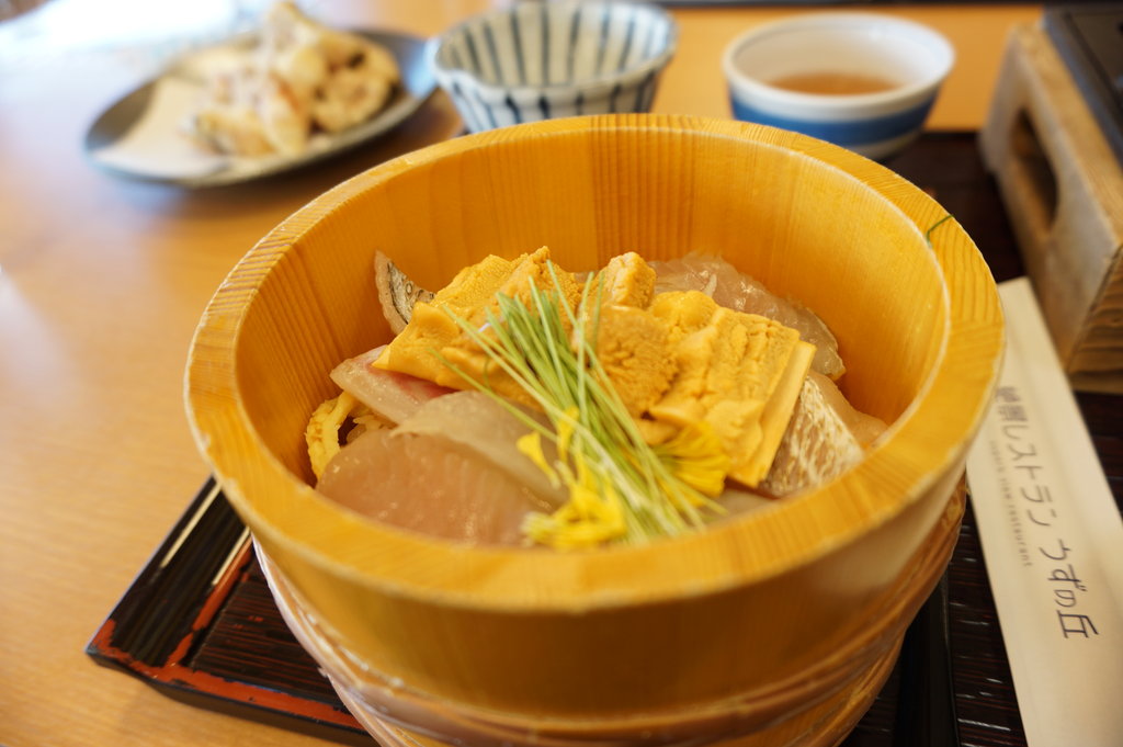 おひつに入った海鮮丼にちっちゃい板ウニが付いた海鮮丼に