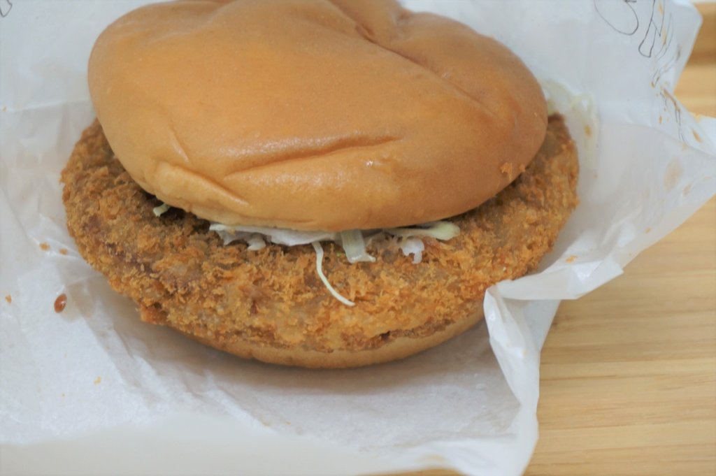 写真と同じしっかりはみ出しサイズのジャンボメンチカツバーガー♪