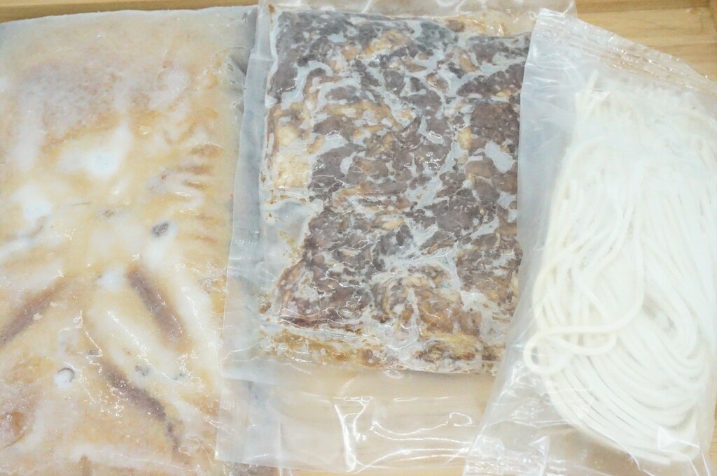 中身は左からスープ、追加の味付け肉、麺♪