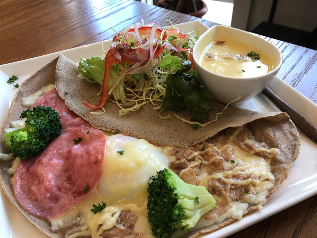 ハムとツナマヨのガレット、サラダ、スープのランチプレート