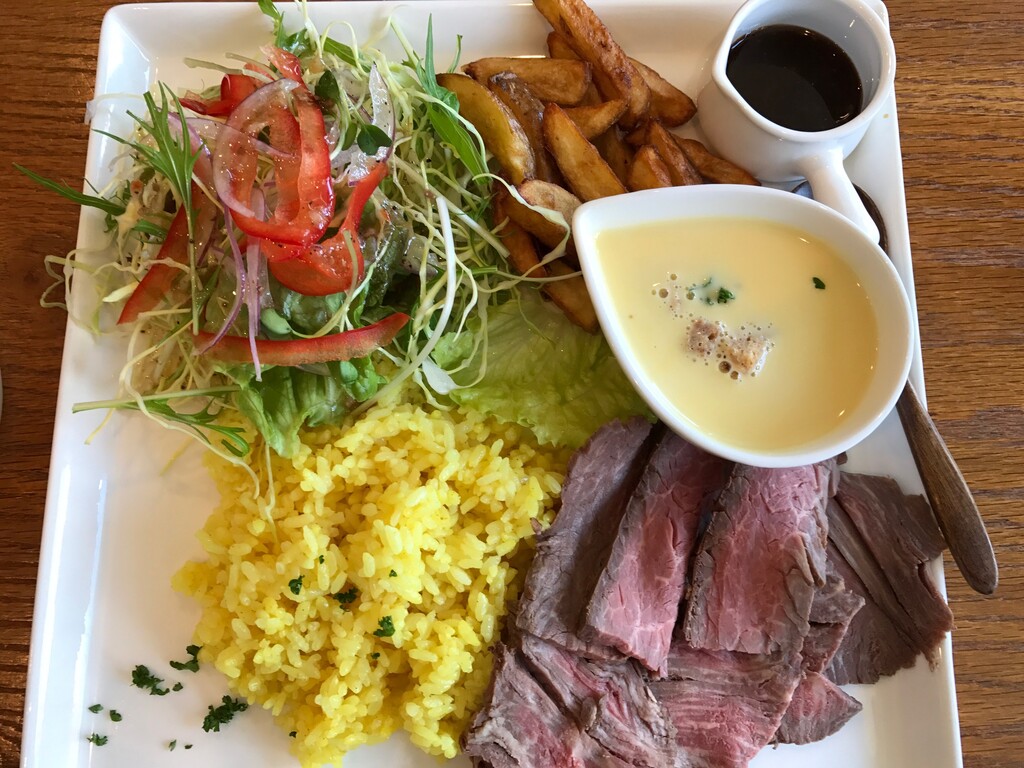 ローストビーフ、サフランライス、ポテト、サラダ、スープのプレート♪
