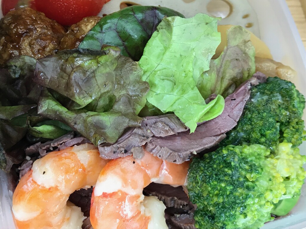 おかずは、牛タンとハンバーグ、海老、温野菜とサラダ♪