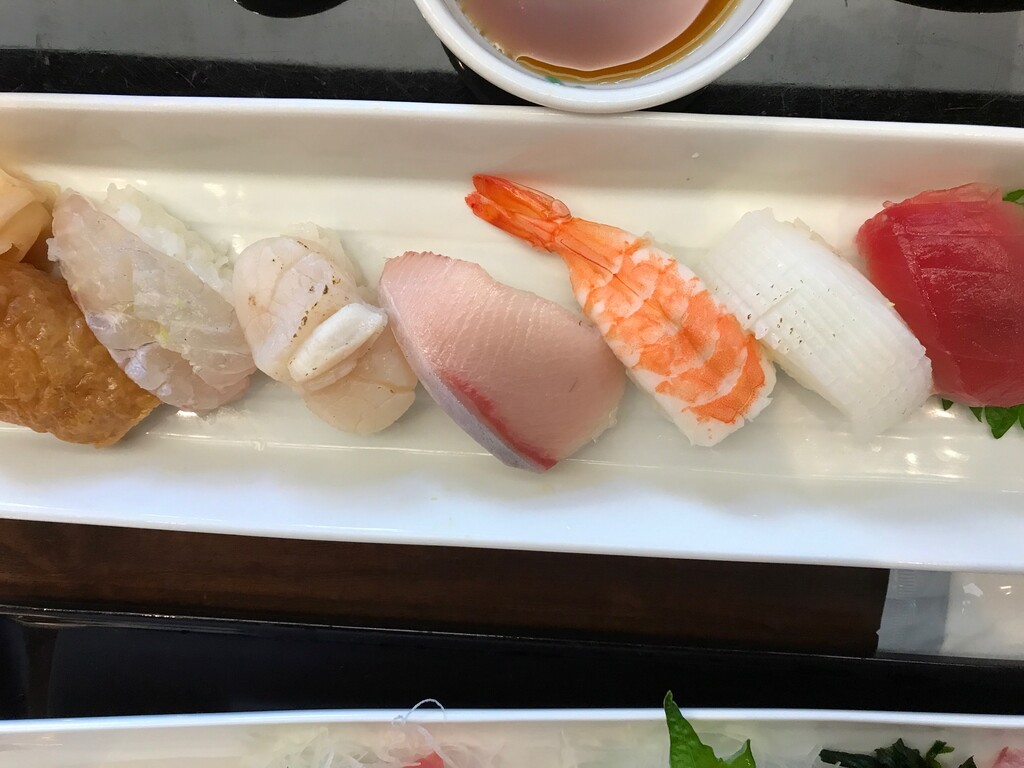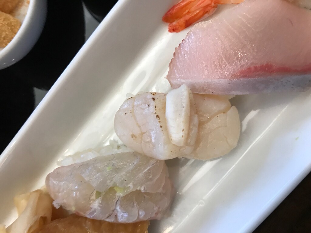 お寿司は赤身、白身、イカ、貝柱、ブリ、海老、いなり♪