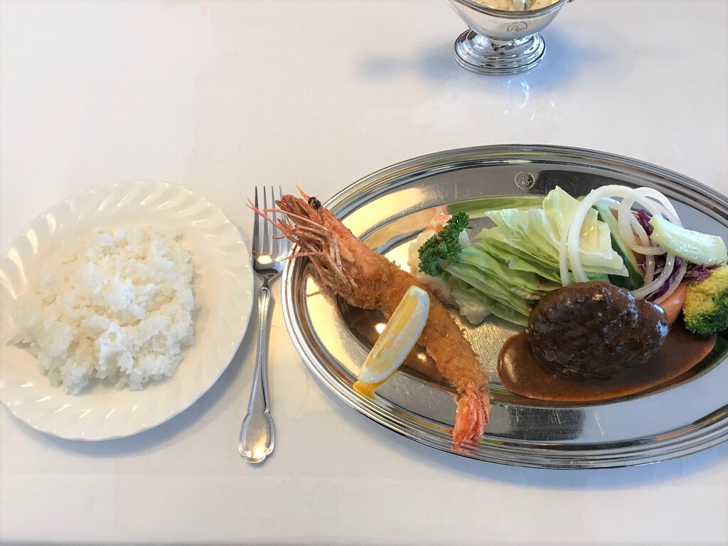 海老フライ、ハンバーグ又はローストポーク、ライス、珈琲のランチ♪