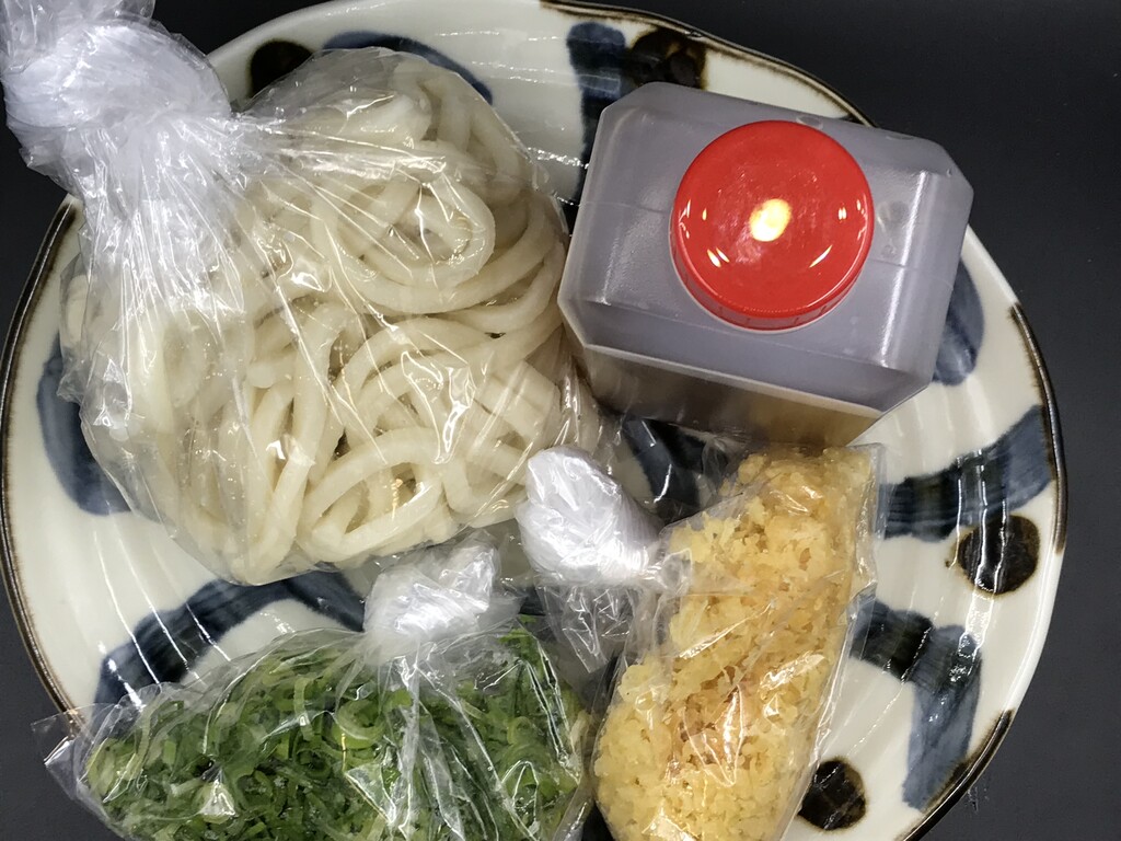 セットはうどん玉、おだし、おネギ、天かす、ごぼ天♪