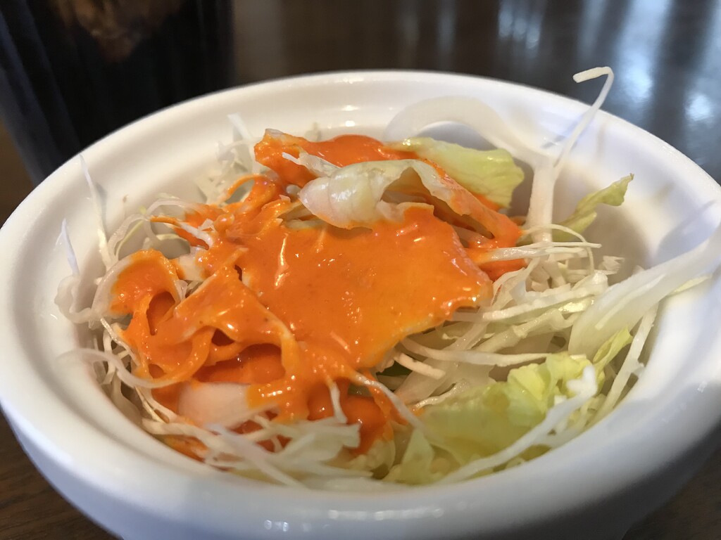 まずは怪しいドレッシングのサラダと