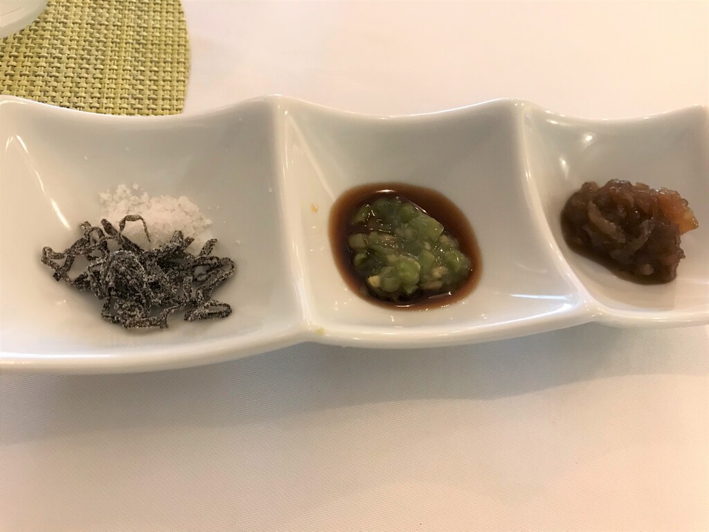 おソースは、アルプス岩塩塩昆布、生醤油山わさび、