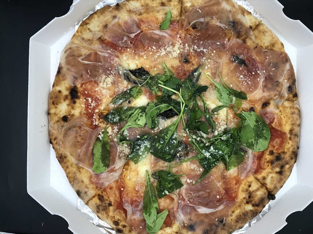 トマトソース、モッツアレラ、パルマ産生ハム、ルッコラのプロシュート♪
