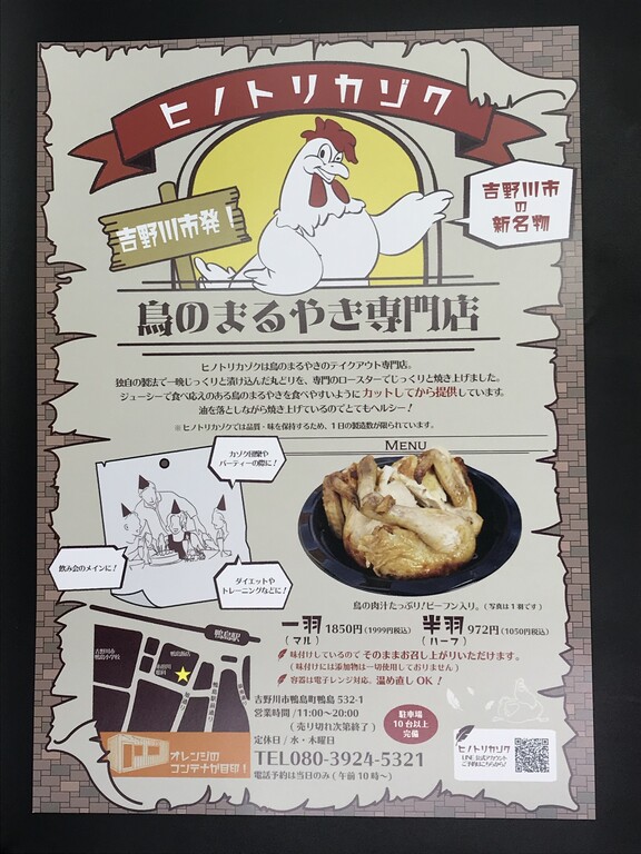 吉野川市鴨島町、JR鴨島駅のすぐ近くに、鶏の丸焼き専門店ヒノトリカゾクさん♪