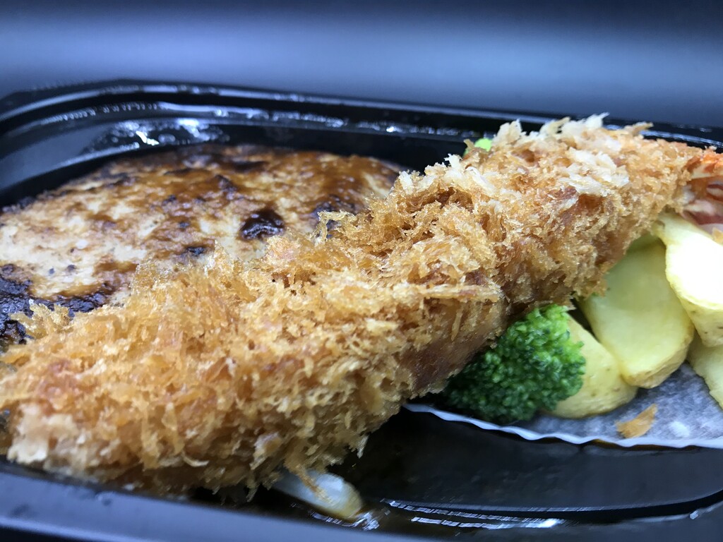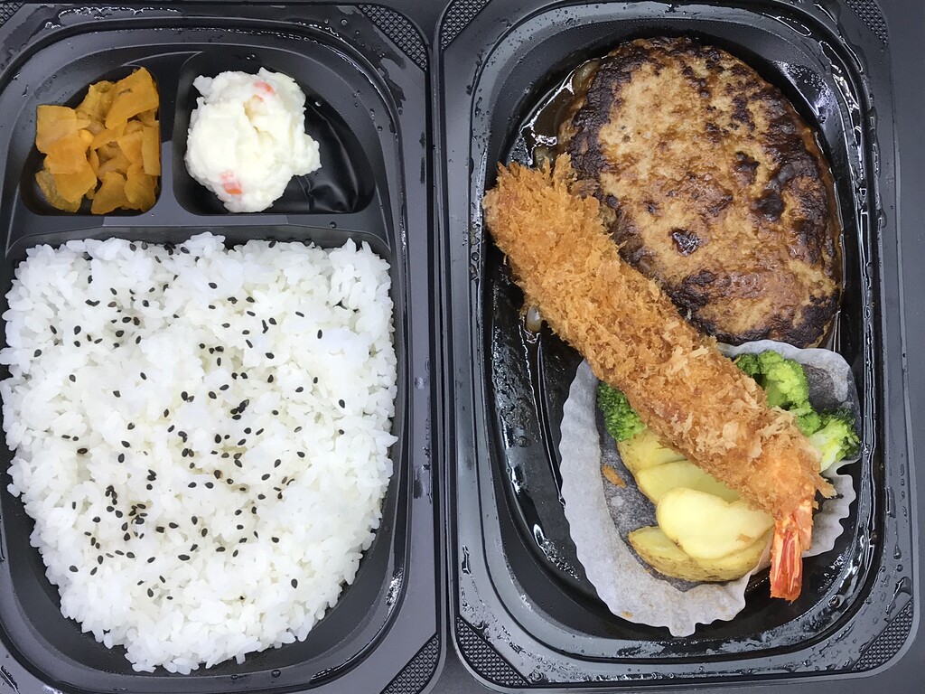 大きなエビフライと、いい焼き色のハンバーグ♪