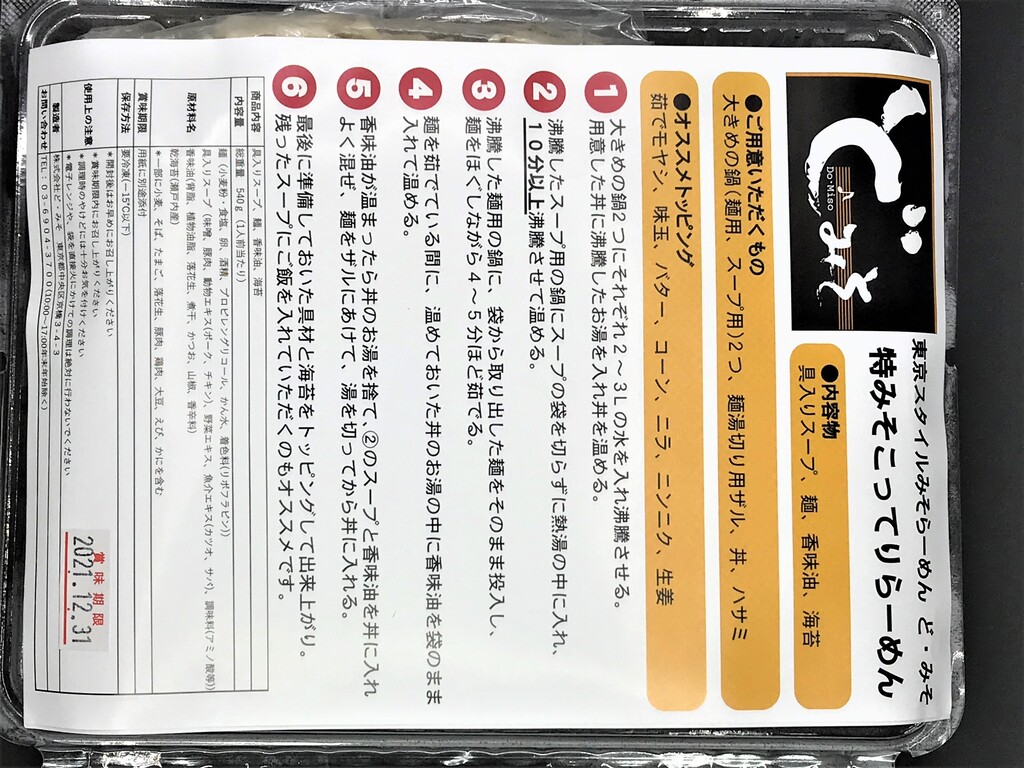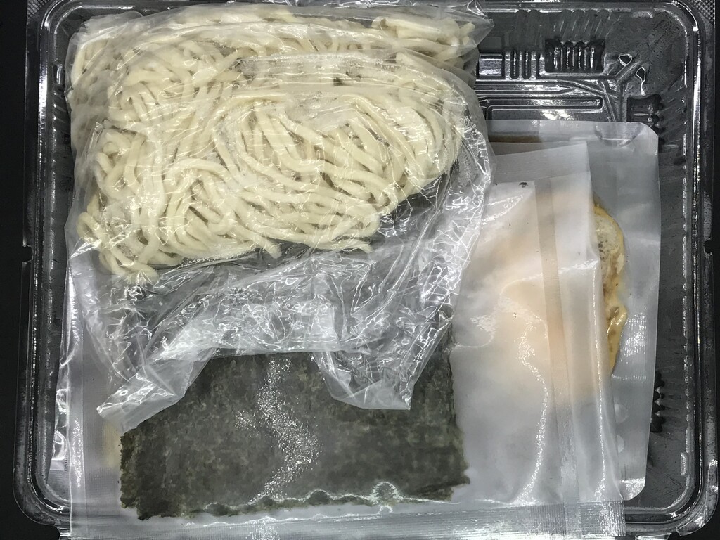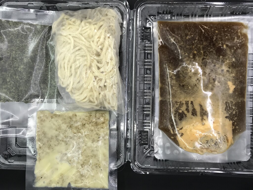 少しずらすと、具材入り冷凍スープと、麺、香味油、海苔のセット♪