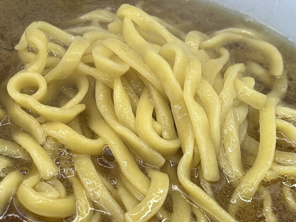 麺は平打ちで少しウエーブのかかったタイプで、結構わしわし食感で、