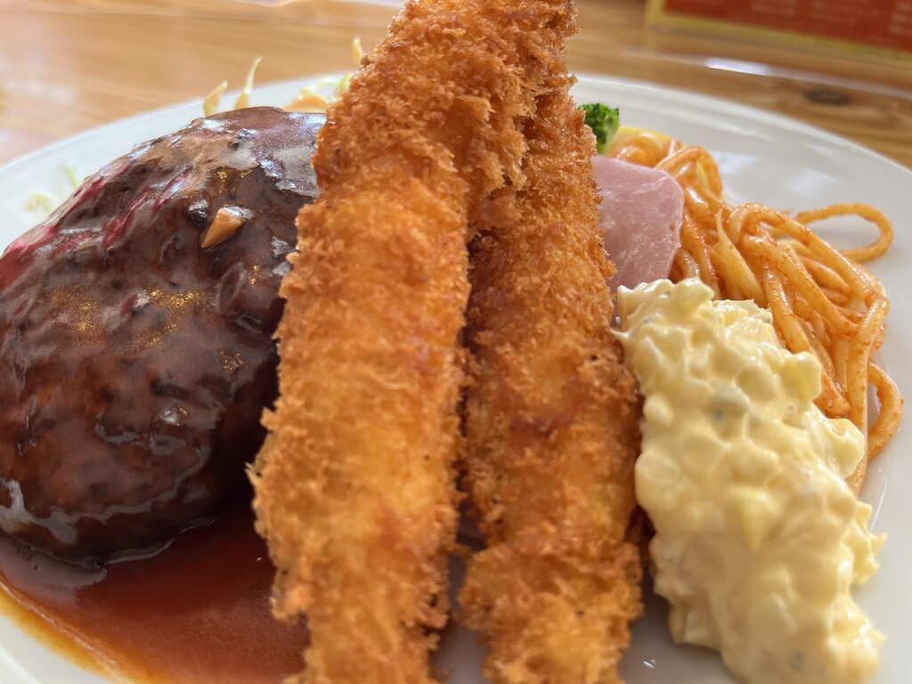 ハンバーグとエビフライの幸せコンボ♪