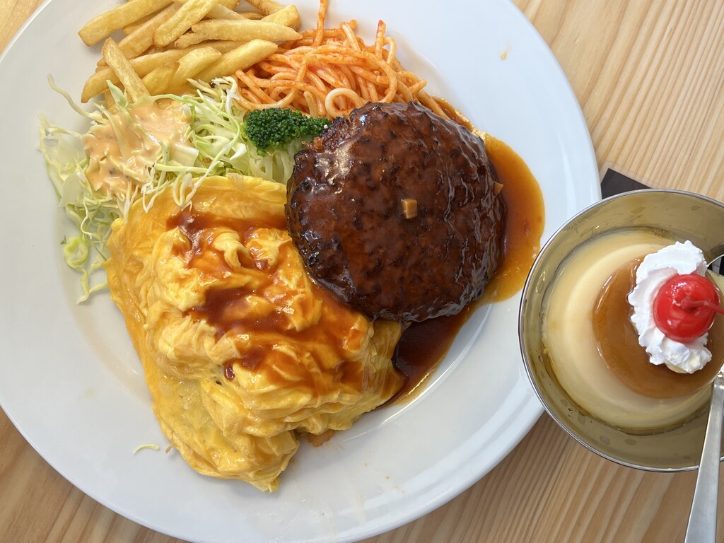 オムライス、ハンバーグ、サラダ、ケチャップパスタ、ポテトのワンプレートに、