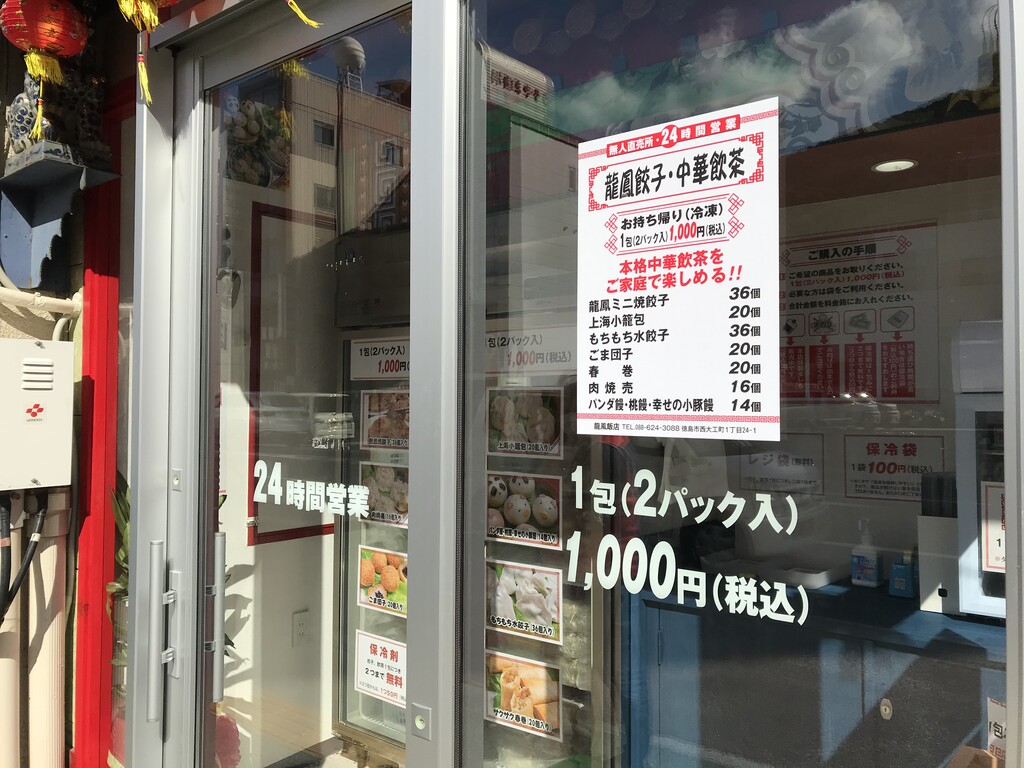 徳島市西大工町、大道沿いの龍鳳飯店さんの店頭に、餃子などの飲茶を売る無人販売所がオープンされました♪