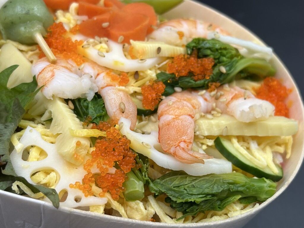 酢飯もふっくら、大きなエビに、とびっこ、レンコン、錦糸卵、