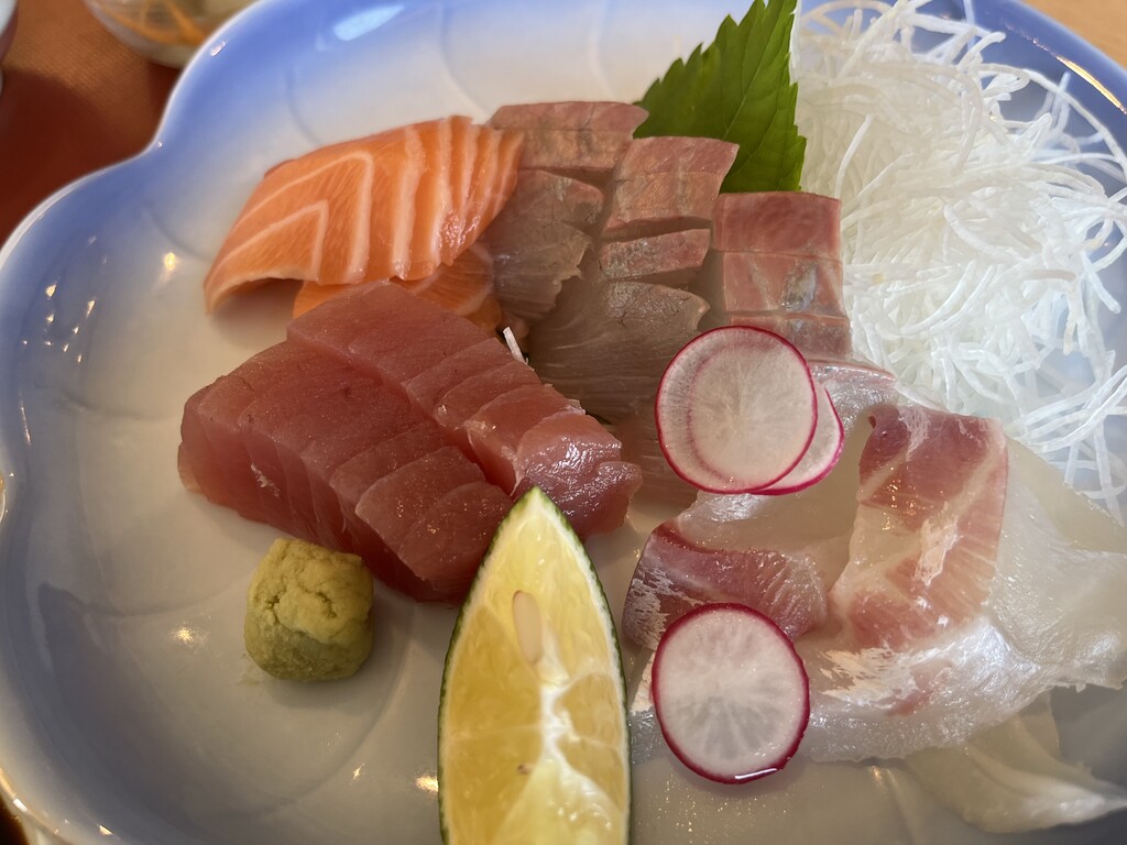 お刺身はマグロ、ハマチ、鯛、イカの4種盛り♪