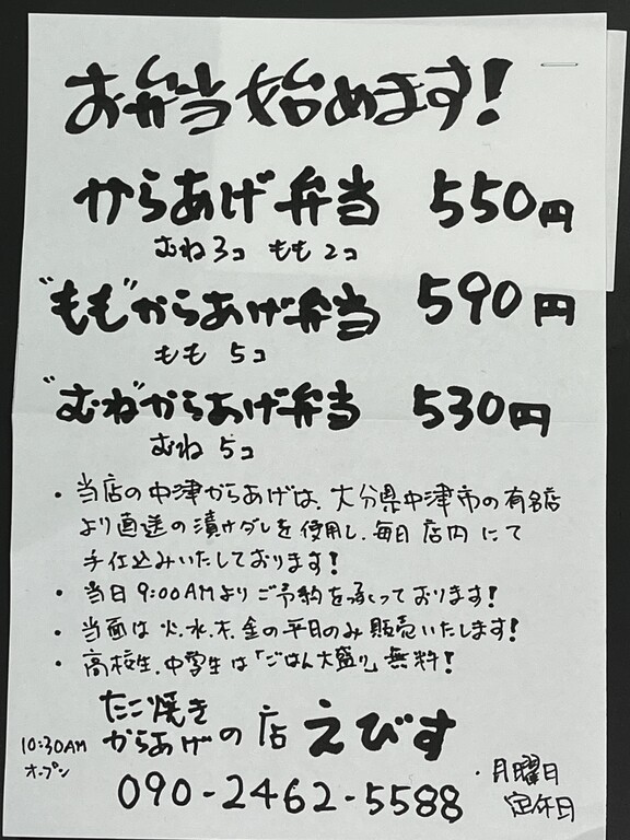 鳴門市撫養町のたこ焼きえびすさんが、唐揚げ弁当の販売を開始されたとのことで、