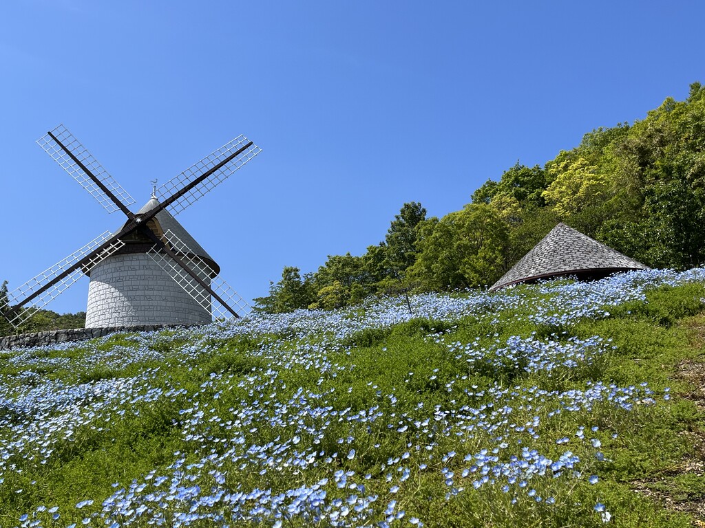 水車が近づくと、青くてかわいいネモフィラさんが現れます♪