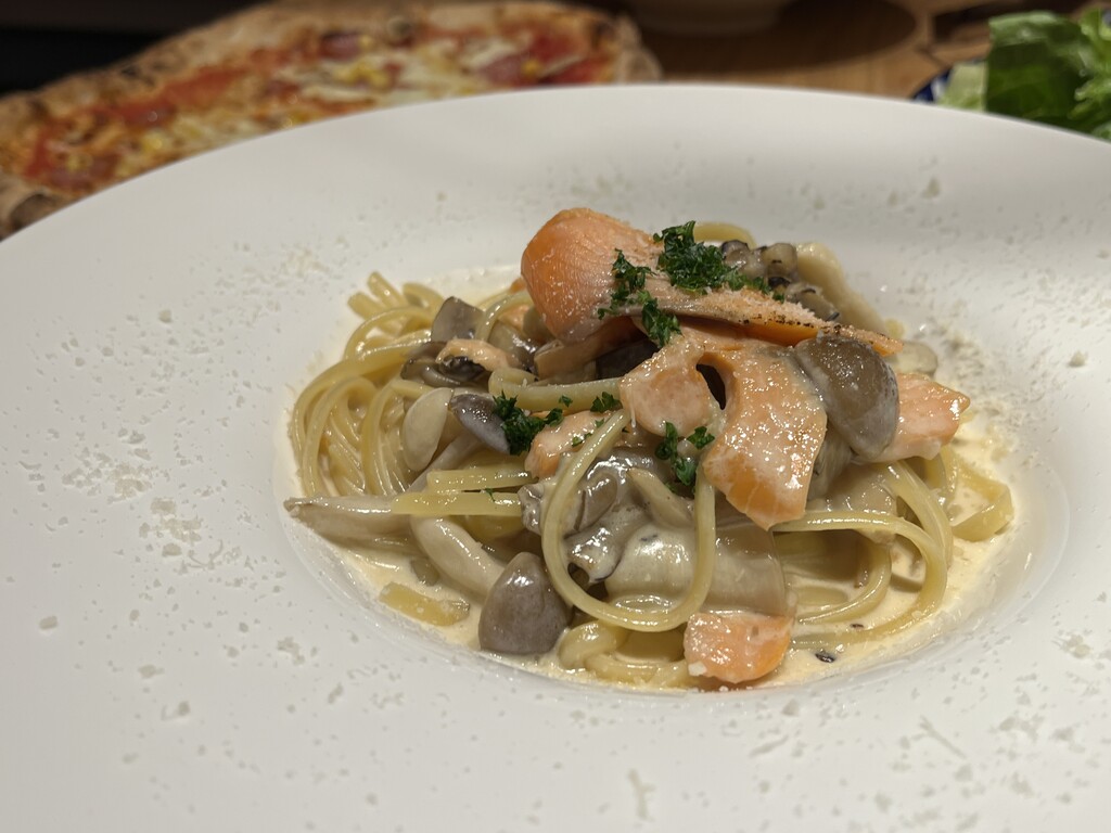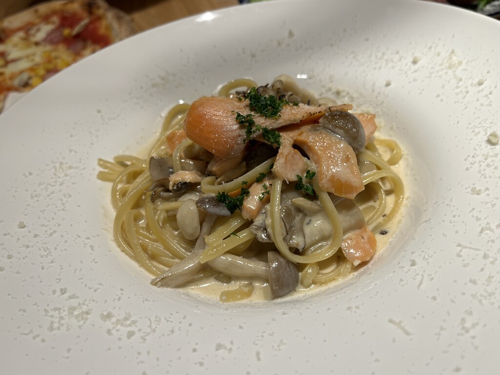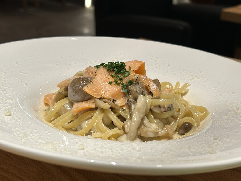 もっちもちタリアテッレかな?にサーモンときのこの旨味、