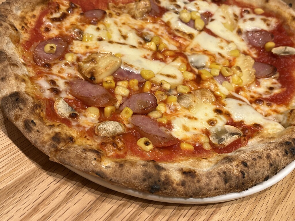 香りのいいトマトソース、モッツアレラ、ソーセージ、コーン、マッシュルーム。