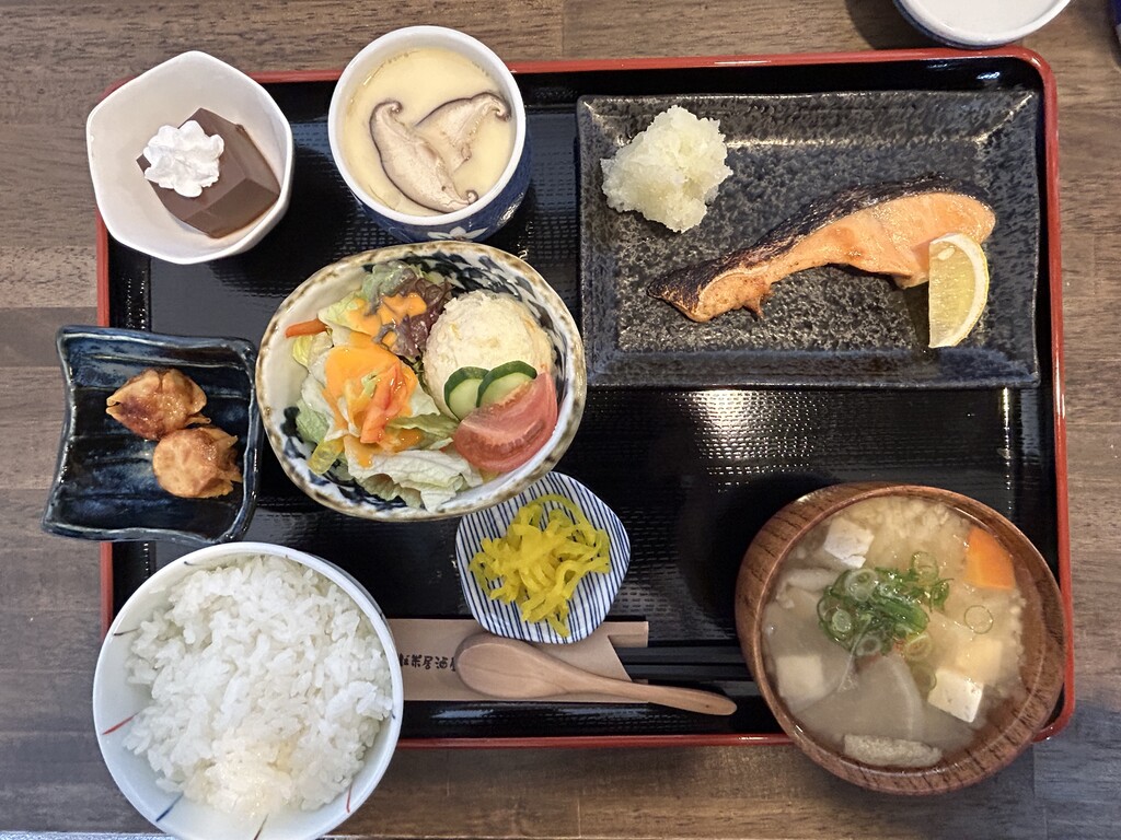 焼き鮭、そば米汁、茶わん蒸し、揚げ焼売、サラダ、ライスの定食♪