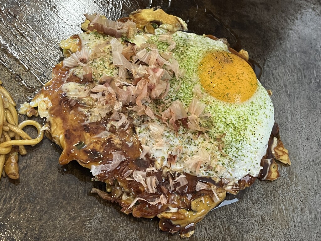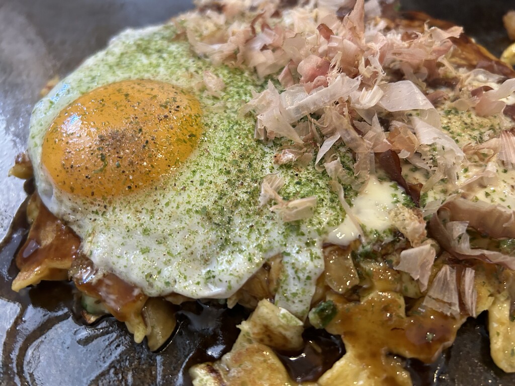 ミックスお好み焼き目玉焼きトッピング♪