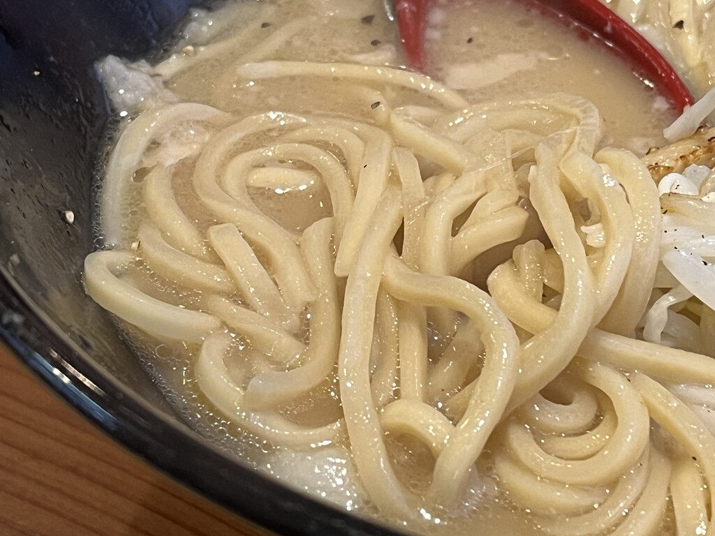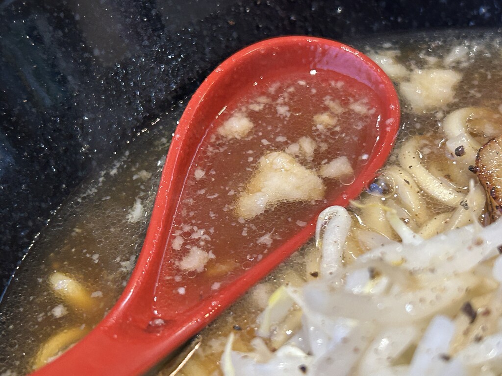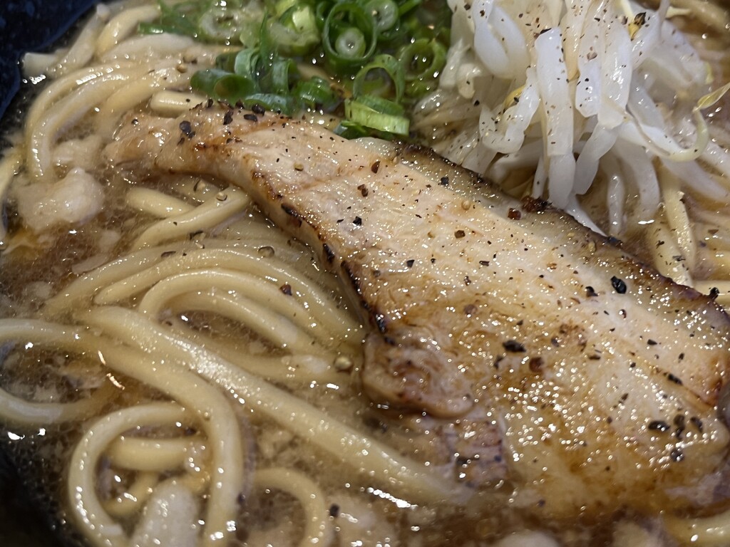 少し濃度のある豚骨ベースのスープに、たっぷりの背油、にんにく。黒コショウの