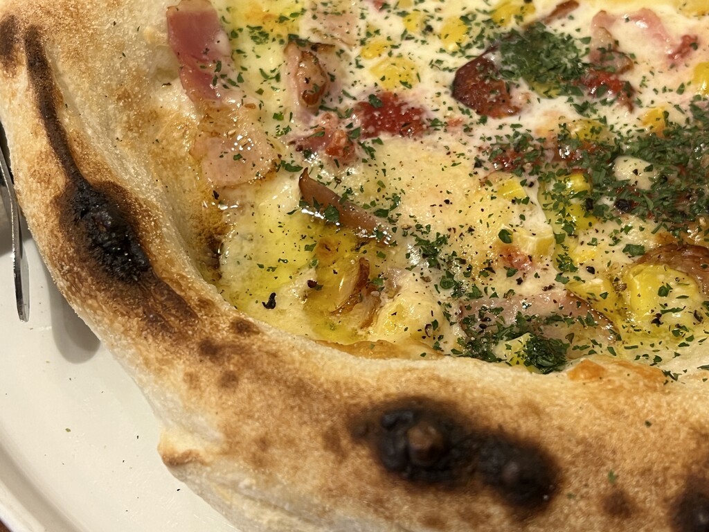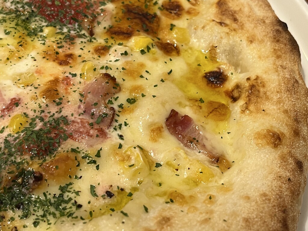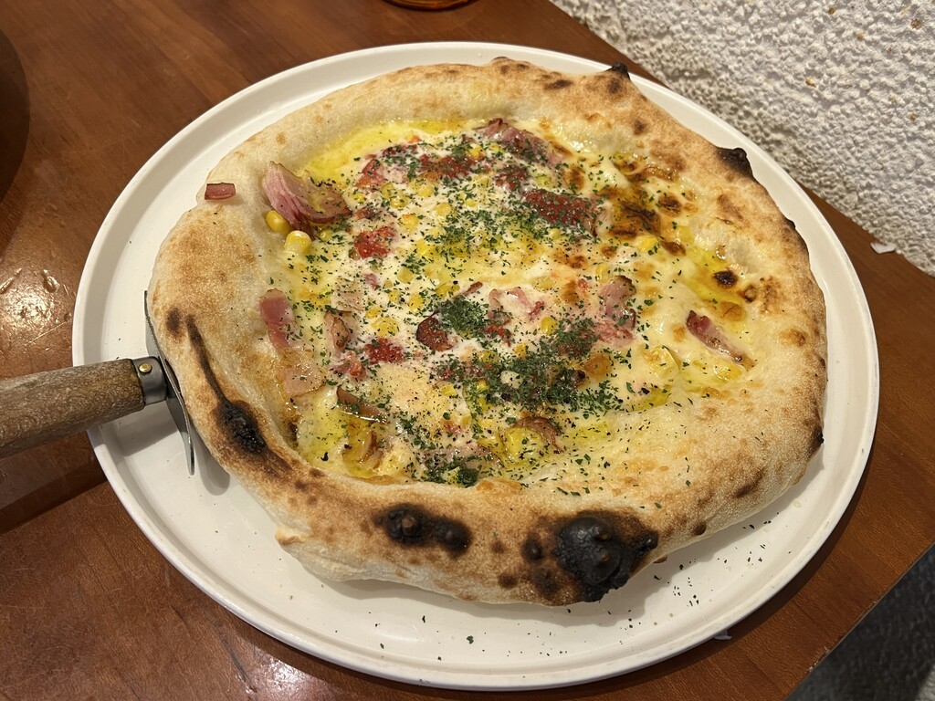 本日のピッツァはベーコンとコーンのピッツァ♪
