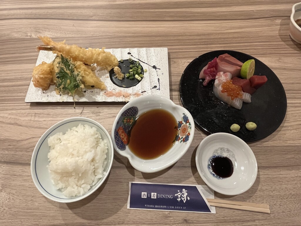 お刺身盛り合わせと天婦羅盛り合わせの定食♪